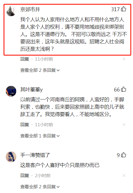 记者查询发现,类似将东北人和河南人排除在外的家政招聘还有不少。一家家政服务公司的工作人员直言:“因为河南人的口碑不是很好。”公司的工作人员表示,“我们只是做招聘信息的整合,很多都是复制粘贴过来。我们只是平台方,我们不负责介绍工作。上面的联系方式都是户主或者招聘公司自己的电话。”