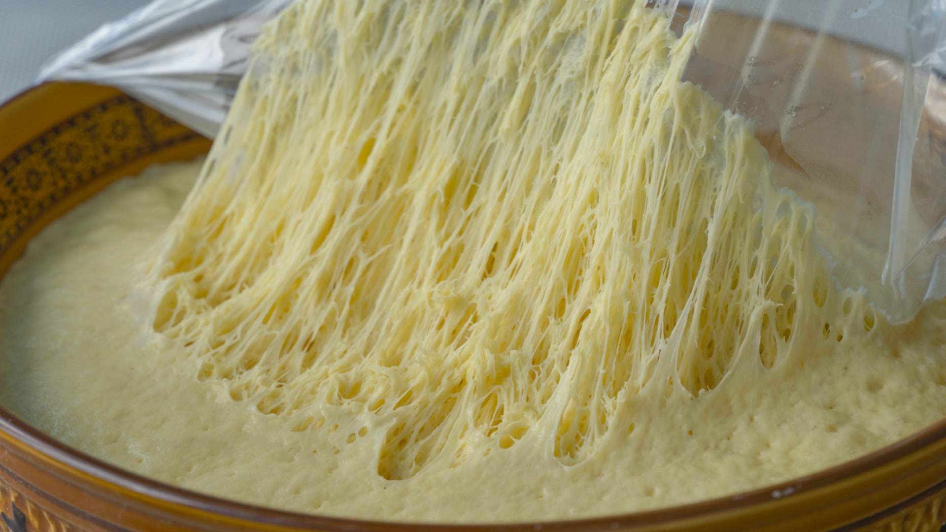 5、15分钟后的面条其实不搓也可以,轻轻的抻一下就可以变得很长,也不会断,而且表面也很光滑;