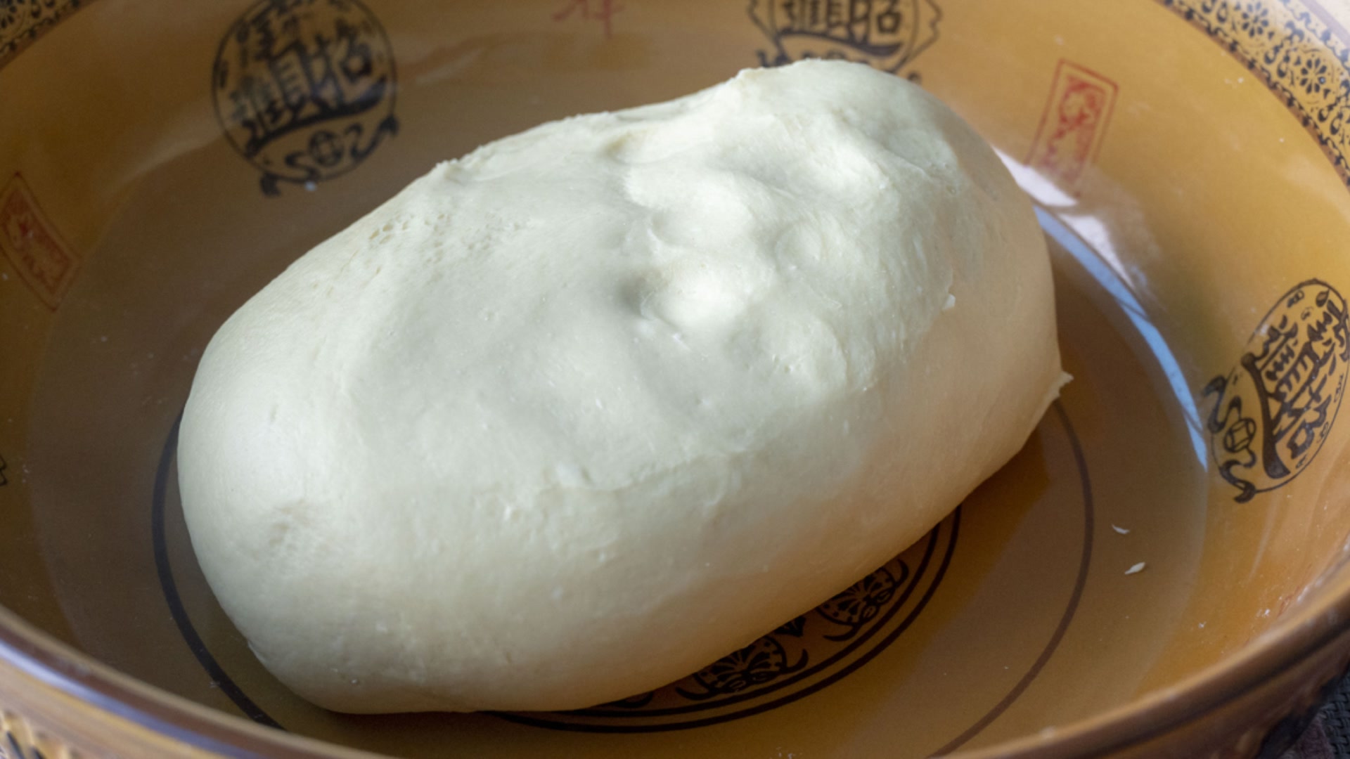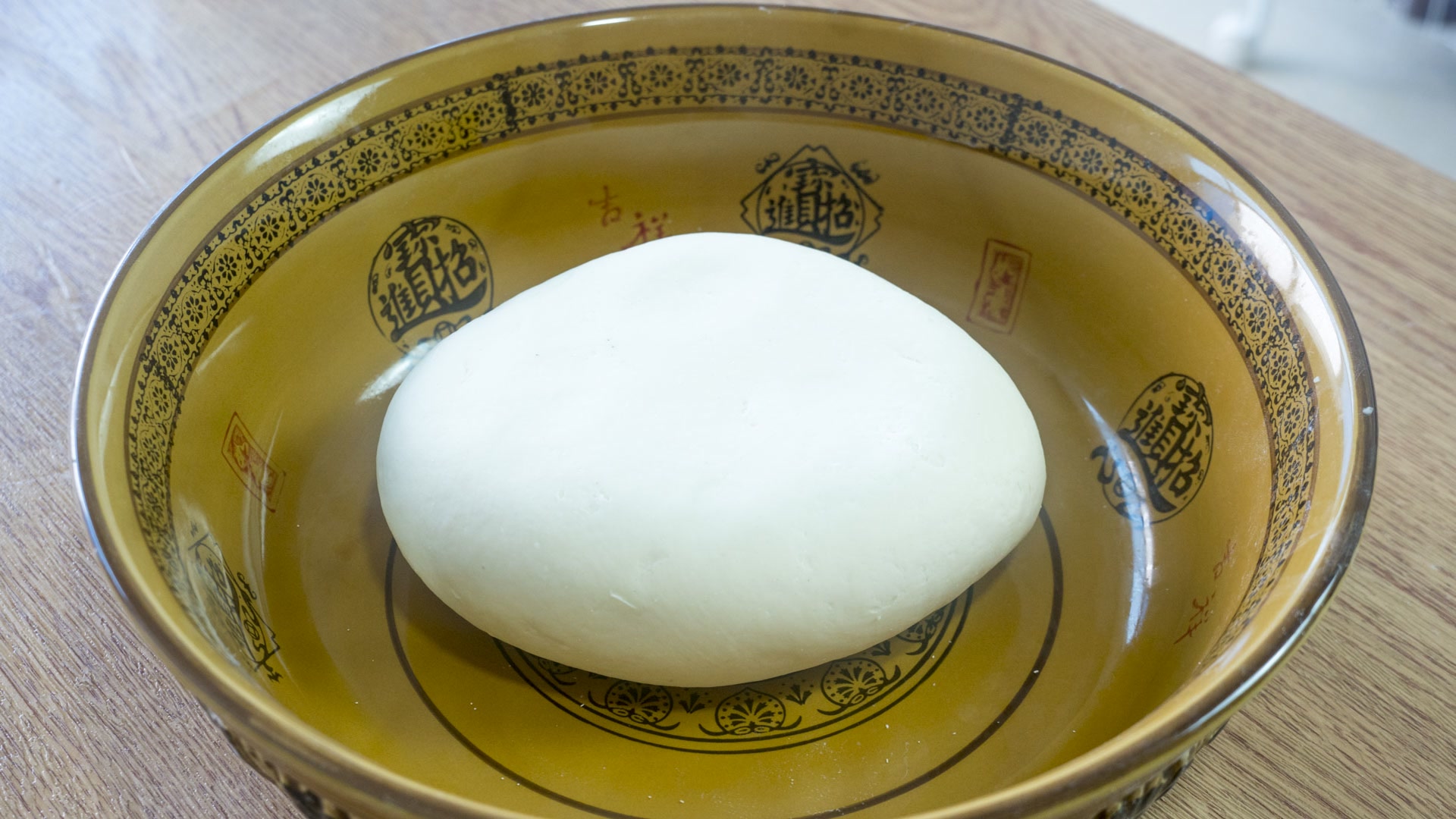 3、揉光后移到砧板上,像搓衣服一样继续揉搓,50克干面粉分次添加进去,边加边揉,这里用的是戗面;