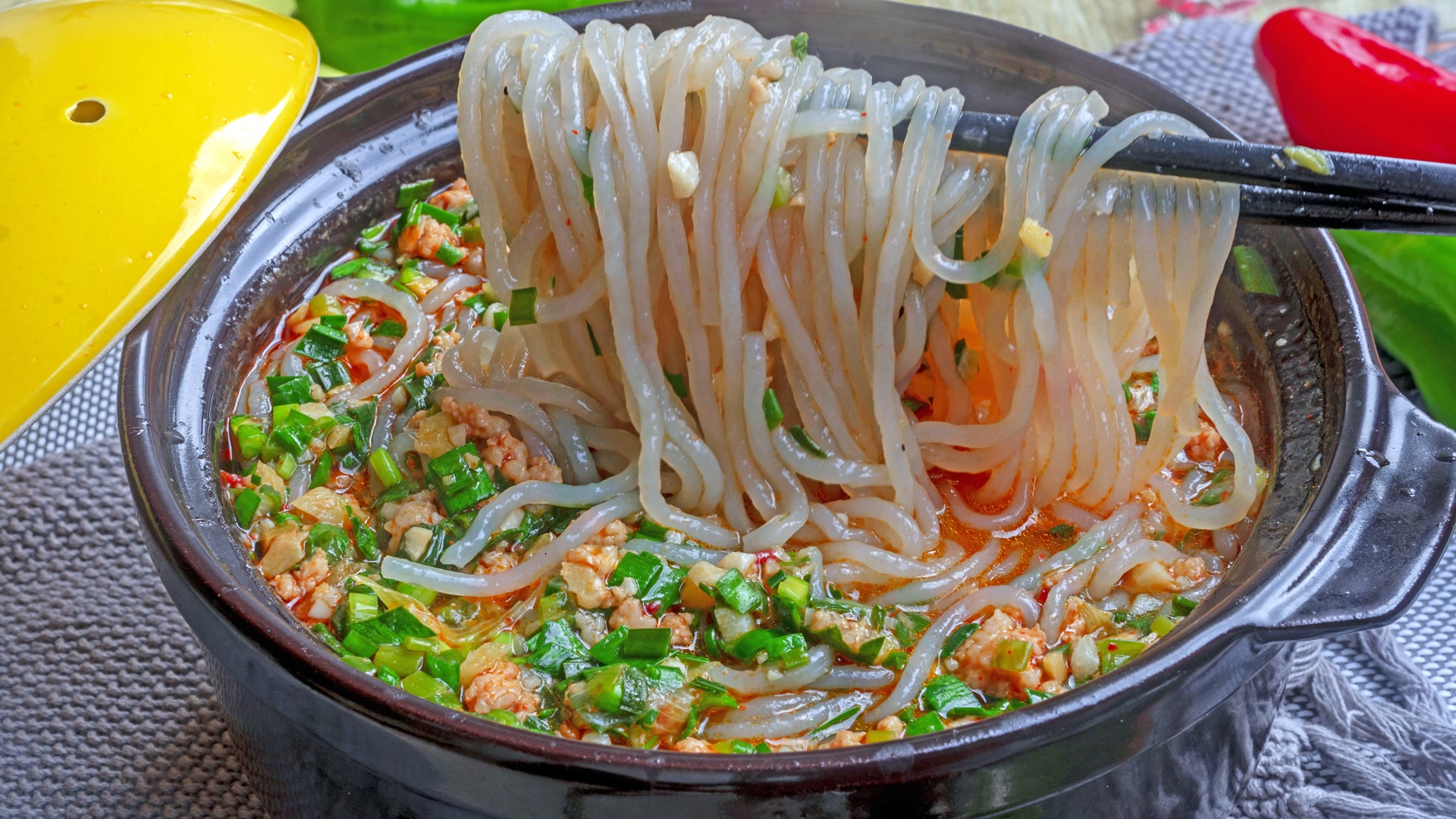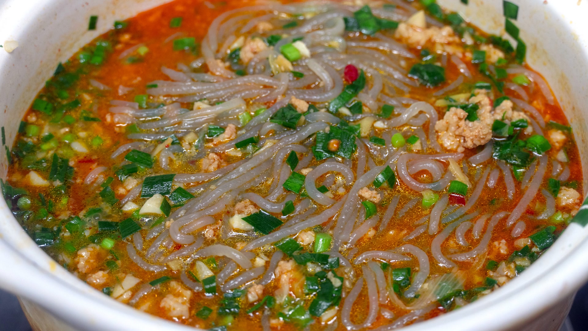 6、热气腾腾的韭香红薯粉就做好了,韭菜、肉沫搭配起来真的超级香,这两样食材都是不可以被代替的,除了红薯粉以外,我觉得汤汁也是精华,反正这一大锅我是全部吃完了,汤汁也没剩,喜欢就赶紧收藏试试吧!