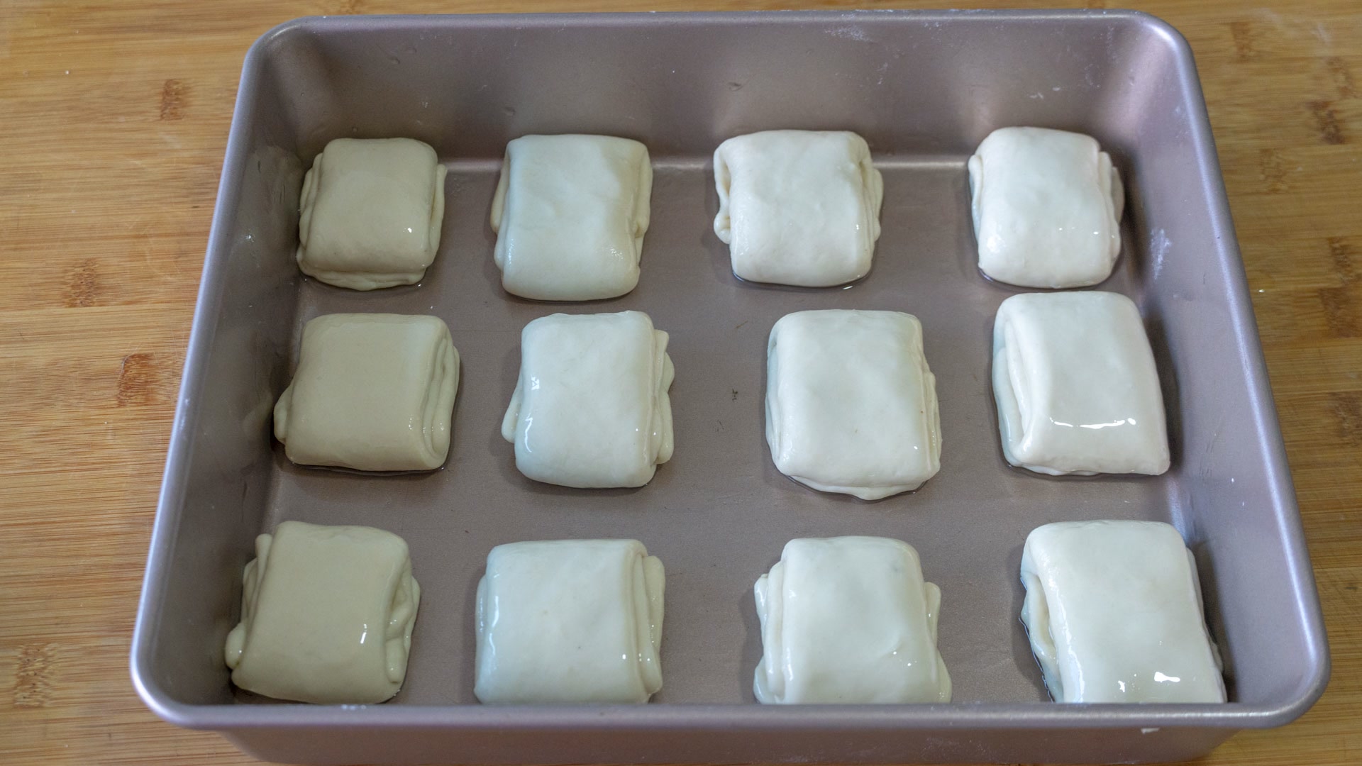 7、把面团儿放进来,封口的那一面朝下摆放,表面再刷点油锁住水分,然后盖上保鲜膜放入冰箱醒面一夜,第二天刚好用来做早餐。