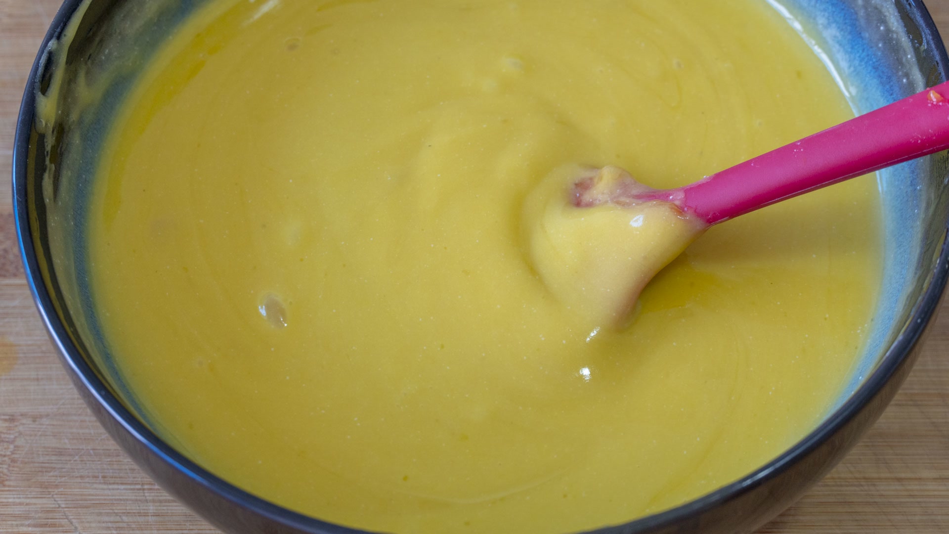4、接着我们往碗里加120克马蹄粉,再把剩余的南瓜糊全部倒进来先拌匀,看不到颗粒后再过筛一遍,这个就是黄色部分的粉浆。