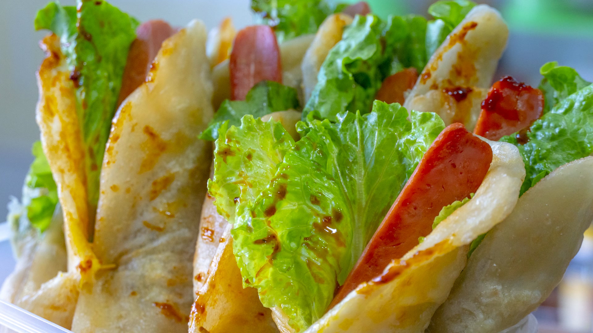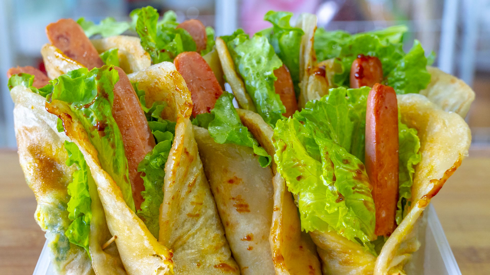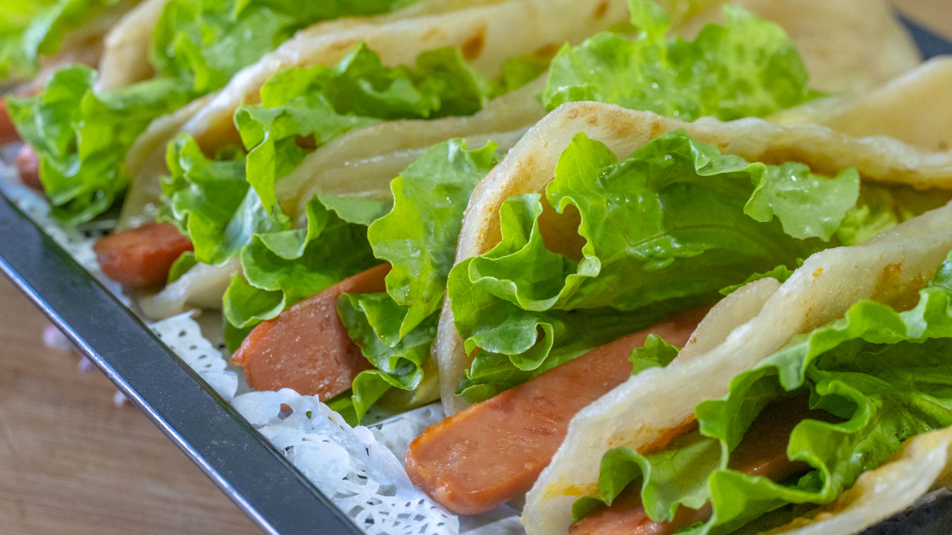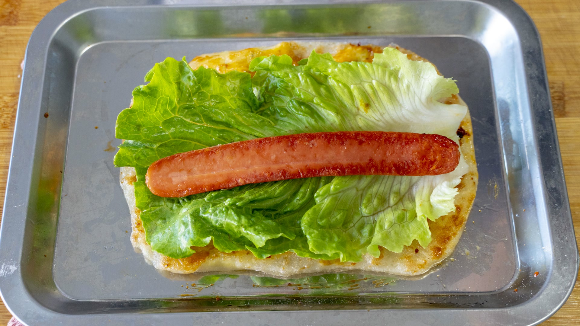 我们的鸡蛋灌饼就做好了,刷上自己爱吃的酱,放上生菜和火腿,卷起来后就可以开动了。