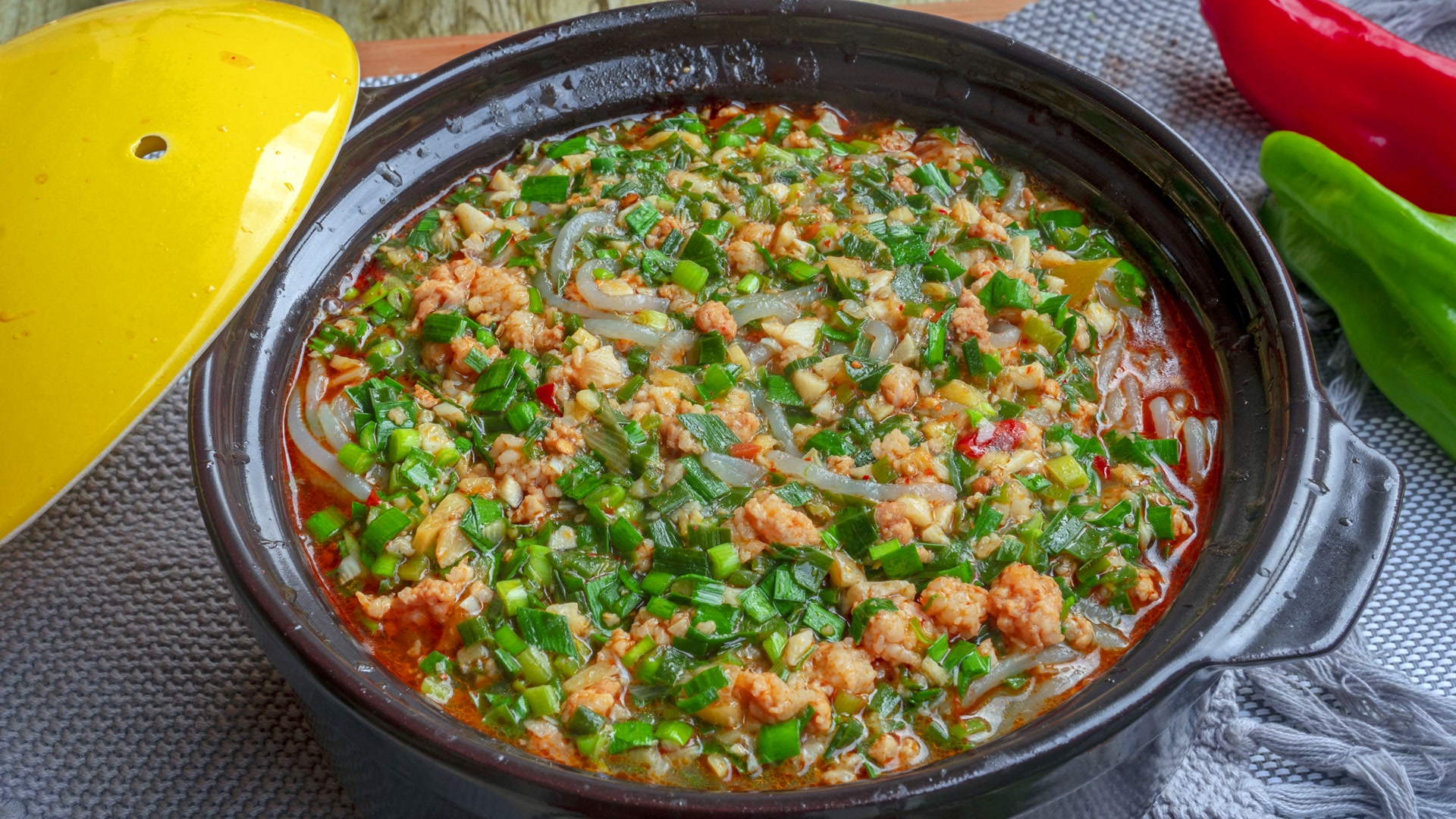 5、倒入砂锅中,1碗清水、盐、生抽、胡椒粉,调一下味道,煮开后加红薯粉,小火继续焖3分钟,撒上韭菜,再焖1分钟