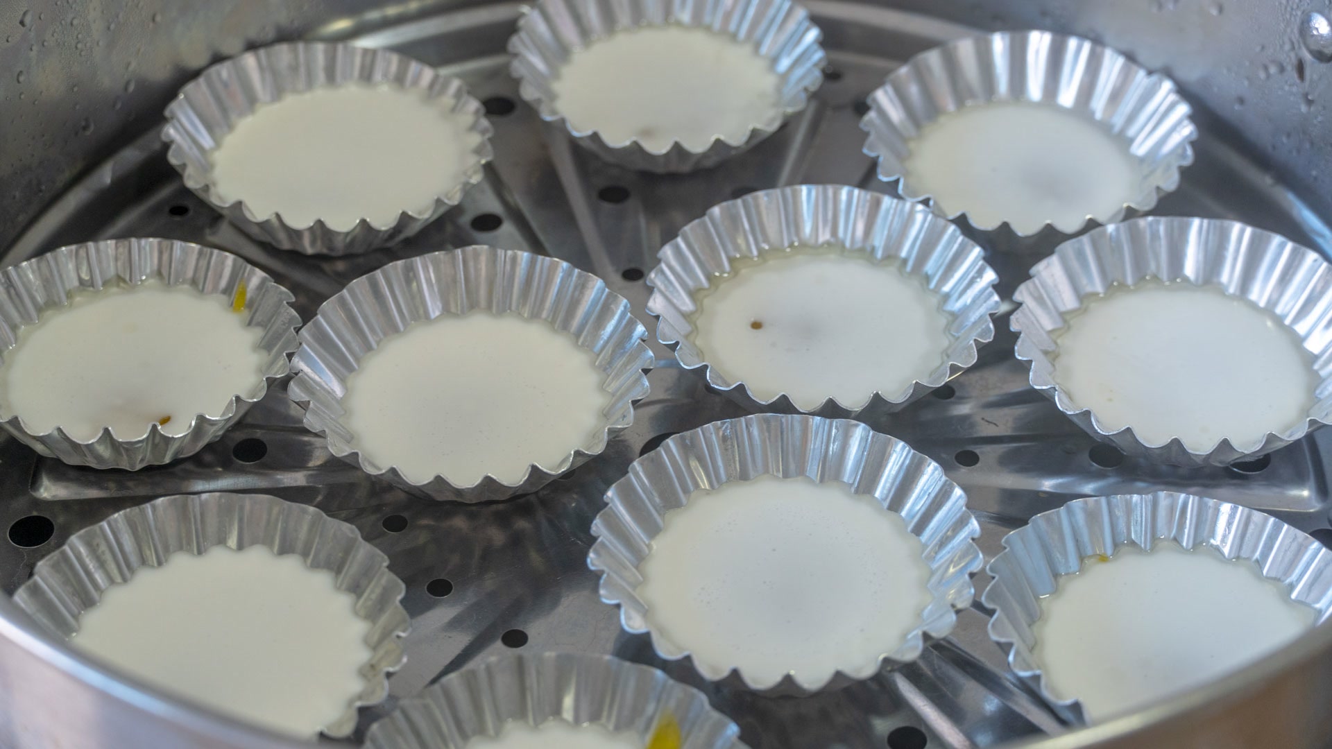 10、接着盖上盖子大火蒸3分钟,然后开盖再倒入一层白色的粉浆,盖上盖子继续蒸3分钟。