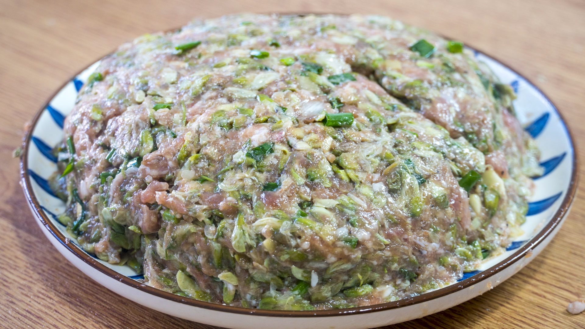 6、包上一大勺腌好的肉馅儿后就可以开始包了,今天来做柳叶包,第一步先捏往里推一下,然后左边捏一下右边捏一下,全部捏完后整理一下就可以了,别人都做柳叶饺子,今儿咱们做个柳叶包,看看蒸出来是不是也一样好看;