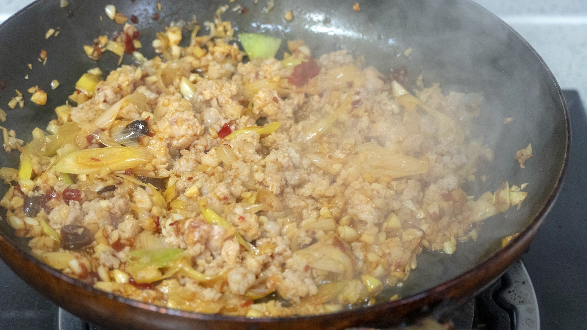 4、热锅倒油,豆瓣酱来一勺,先炒香,葱姜蒜加进来,炒香后把肉沫加进去炒一炒,炒过的肉沫会更香一些,喜欢吃辣的还可以放点辣椒面;