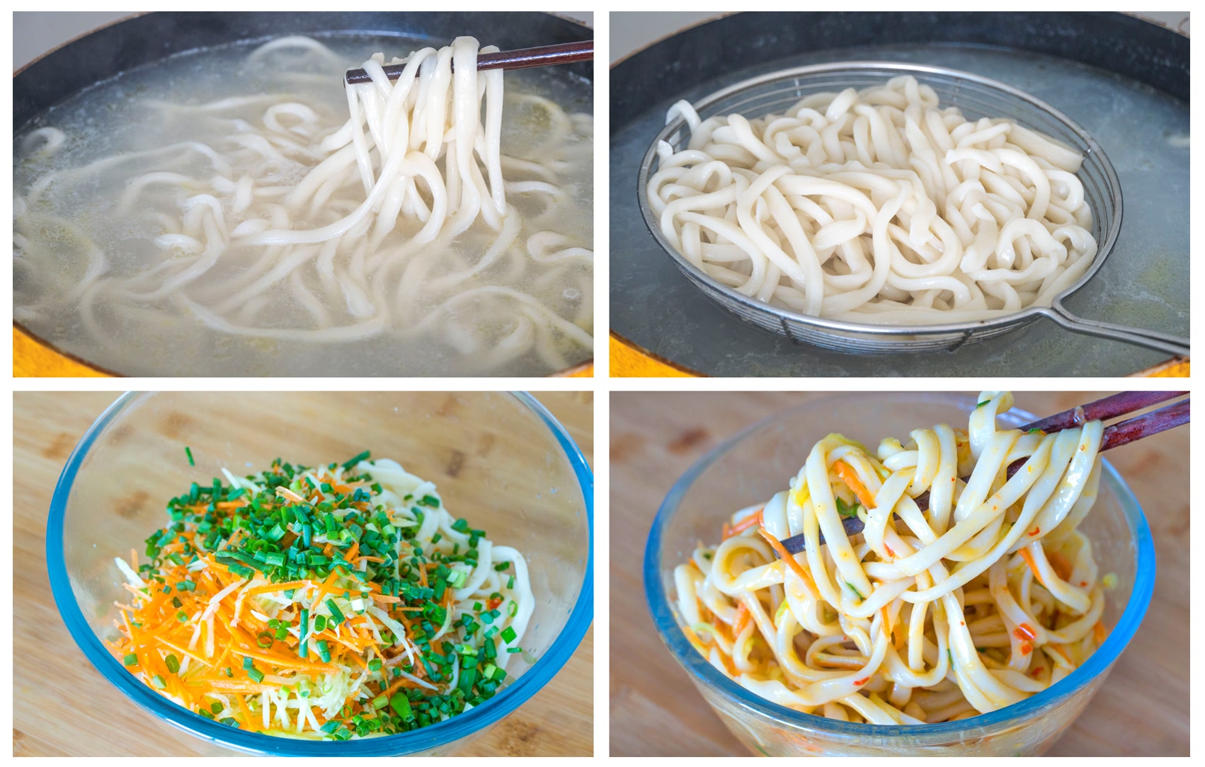 9、夏天到了,我们就来做凉拌面,更开胃一些,生抽、醋、香油、盐、胡椒粉、蒜蓉酱、黄瓜丝、胡萝卜丝、葱花,拌匀后就开始开动啦。