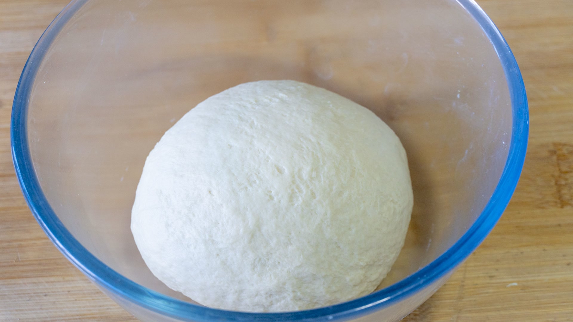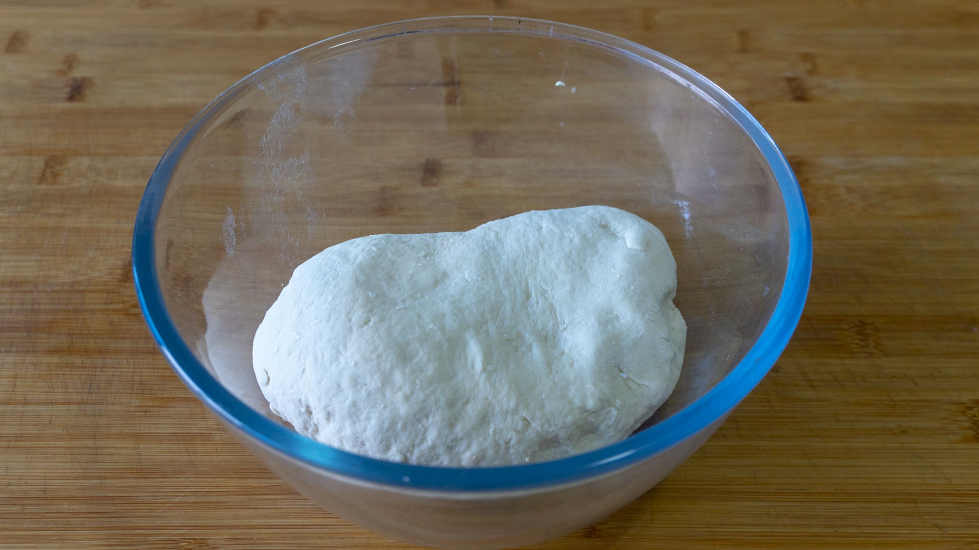 4、慢慢的这个面团儿就会越来越光滑了,然后盖上保鲜膜再次醒面10分钟。10分钟后继续揣面,同样的步骤和手法重复三次。
