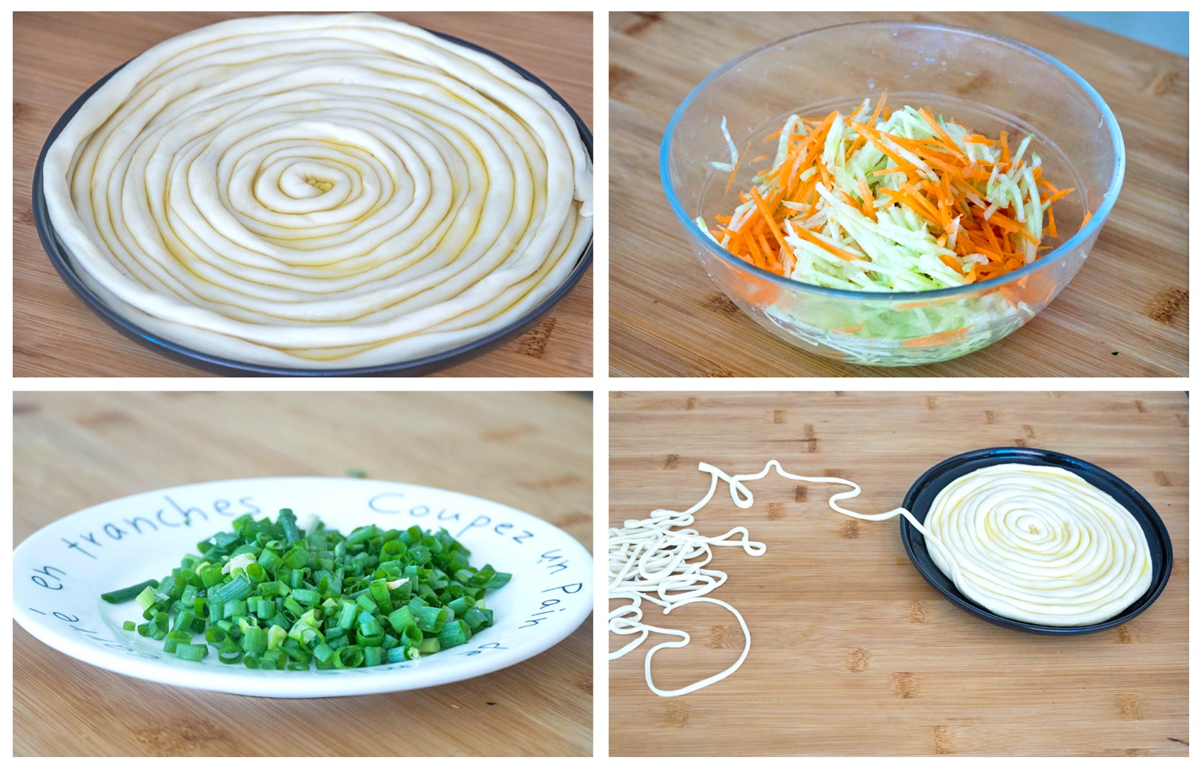 再次对折后包起来,像迭被子一样迭整齐,这个手法主要是让我们的封口更紧实,全部做好后盘子底部再刷油。