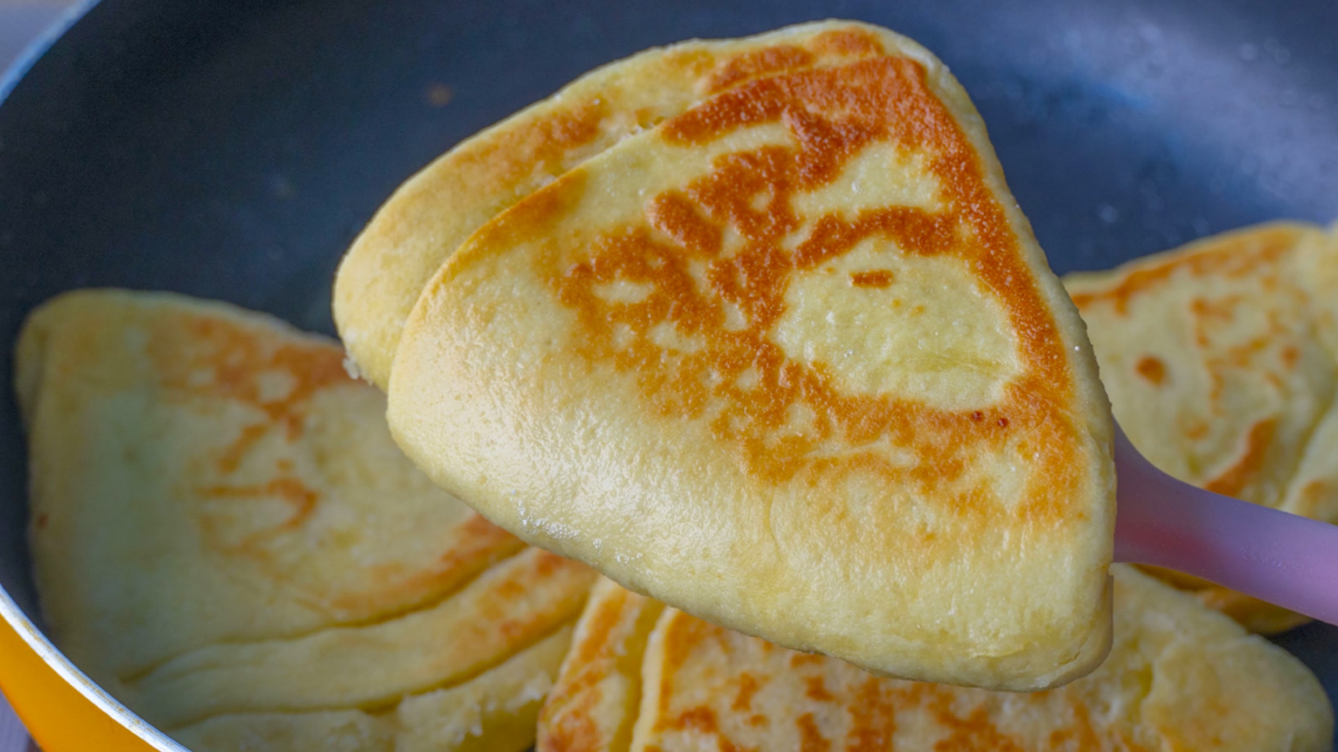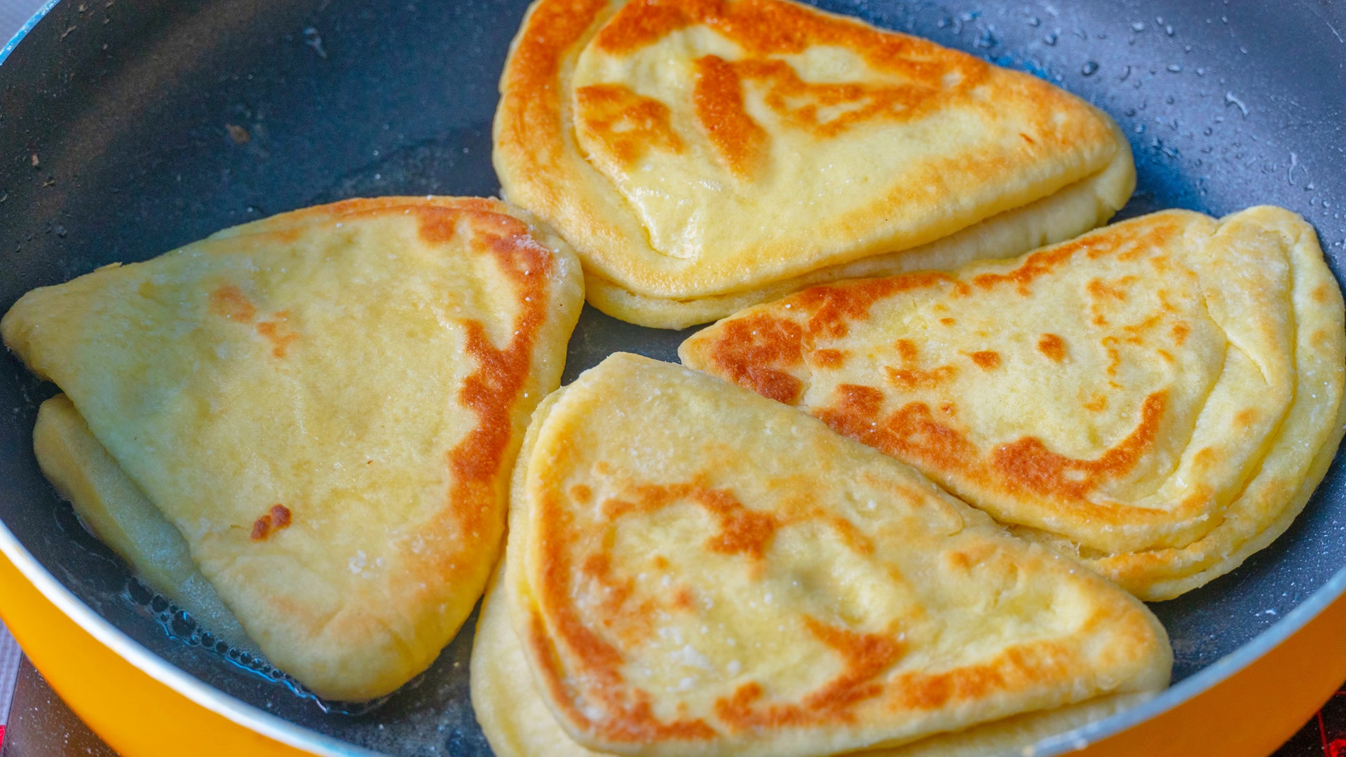 10、平底锅预热刷油,用中小火烙,底部定型后立马翻面烙另一面,两面都定型后小泡泡就慢慢出来了,接着再勤翻面,这个面饼就鼓起来了。