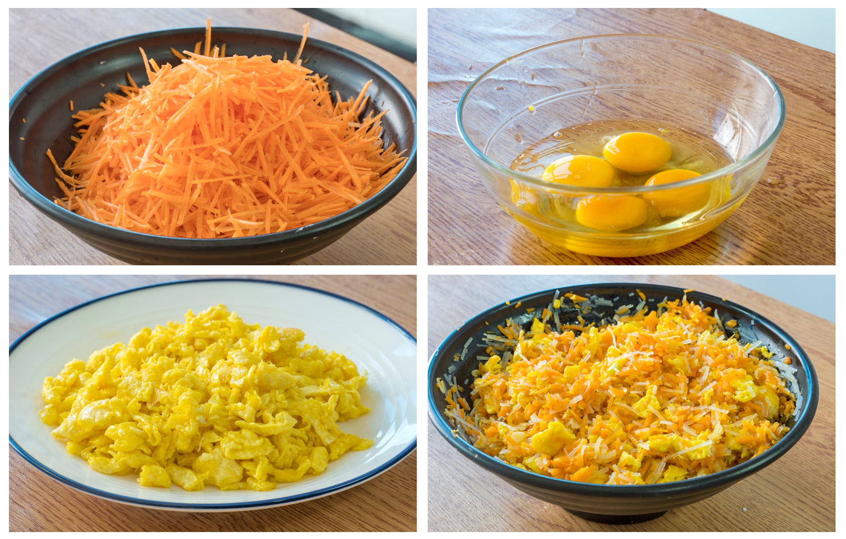 馅儿:胡萝卜2根 鸡蛋4个 葱姜蒜适量 虾皮适量 粉丝1把 盐适量 鸡精1勺 胡椒粉适量 香油1勺