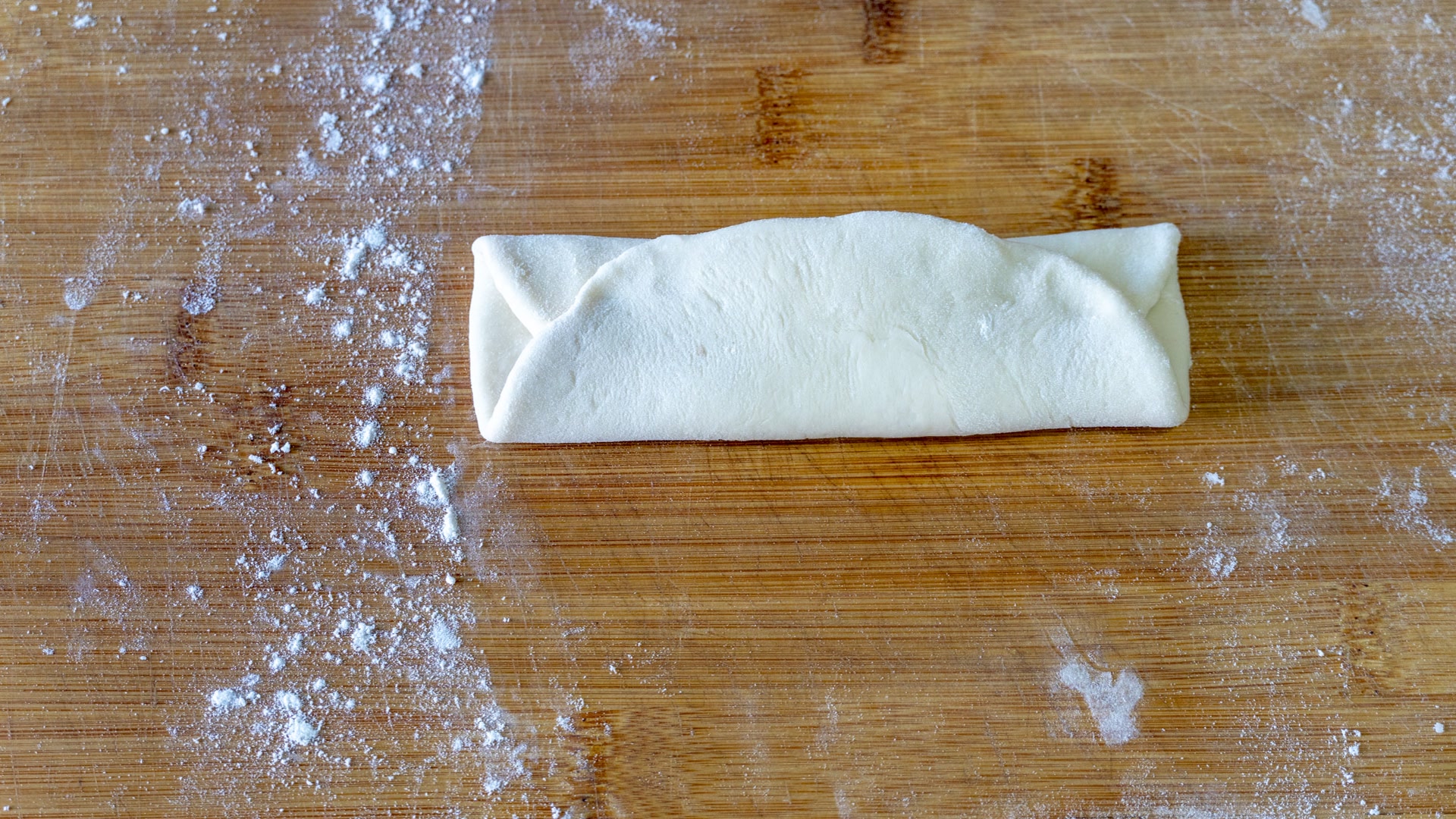 6、然后开始对折把油酥包起来,再用手轻轻的拍一下,把里面的气体排出来。