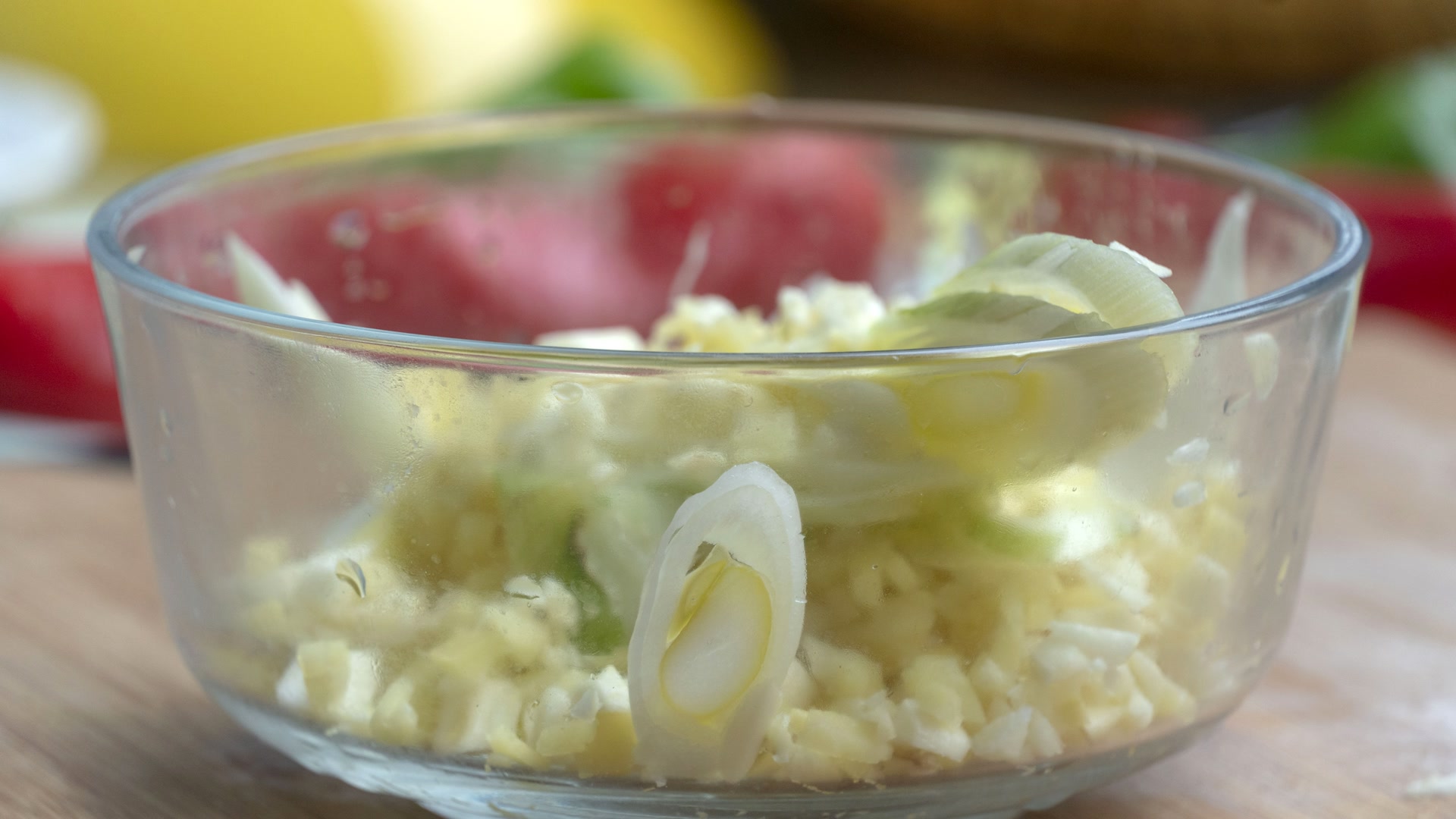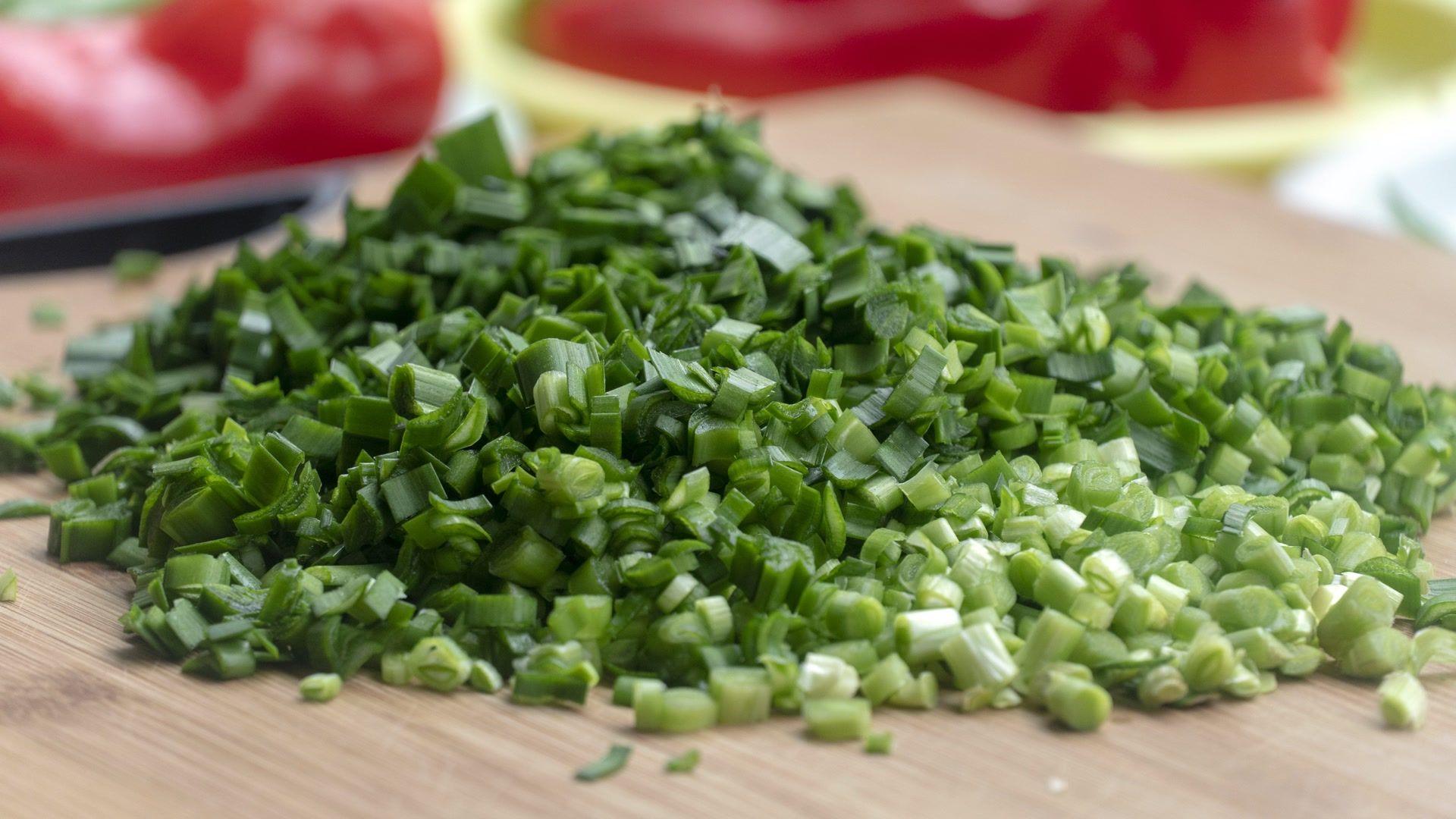 8、先切点葱花,再准备一个杯子,往里面打入一个鸡蛋,然后加一小把葱花,搅散后备用。