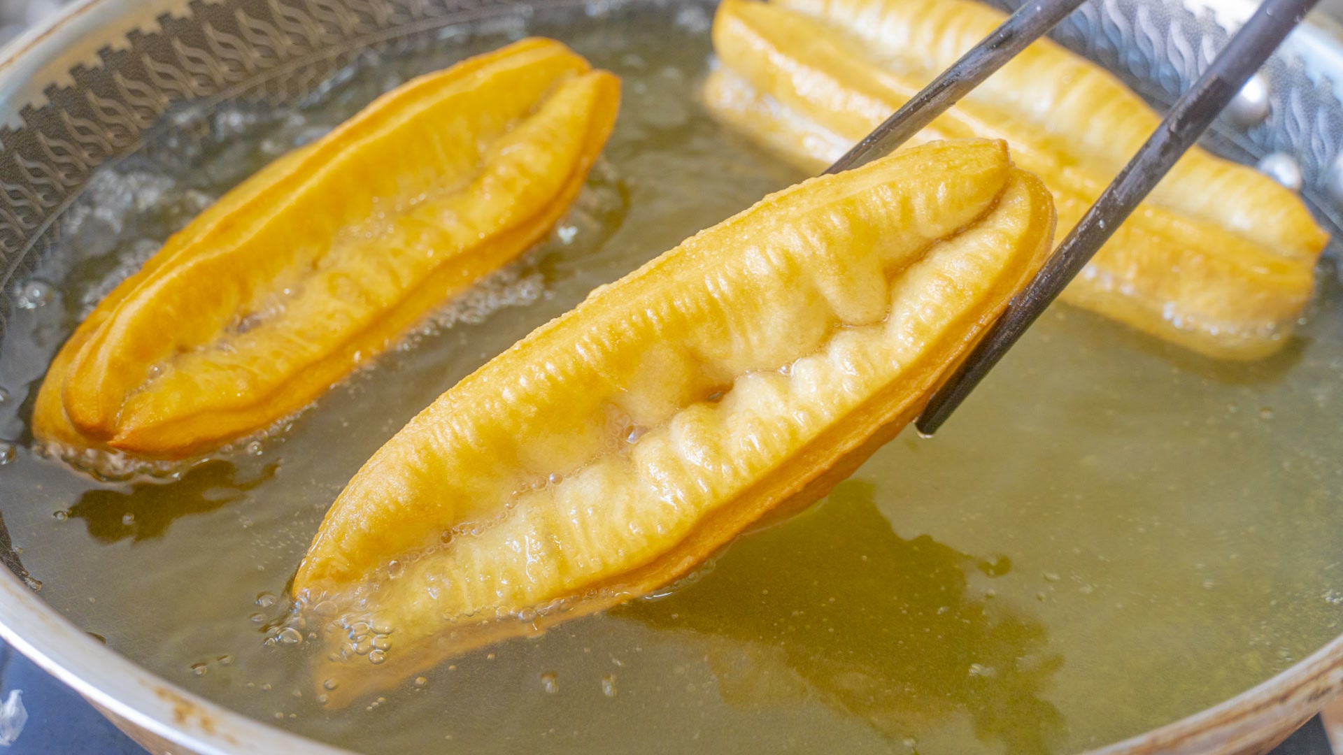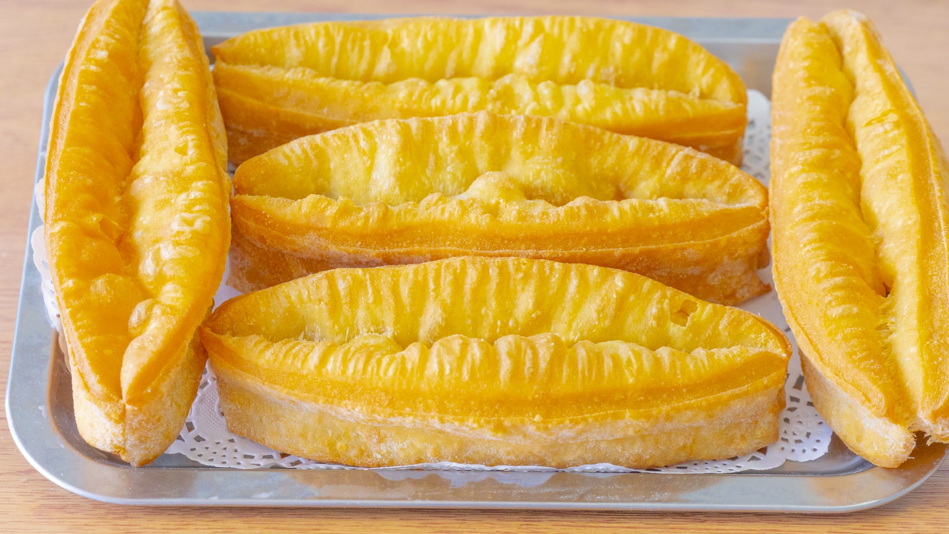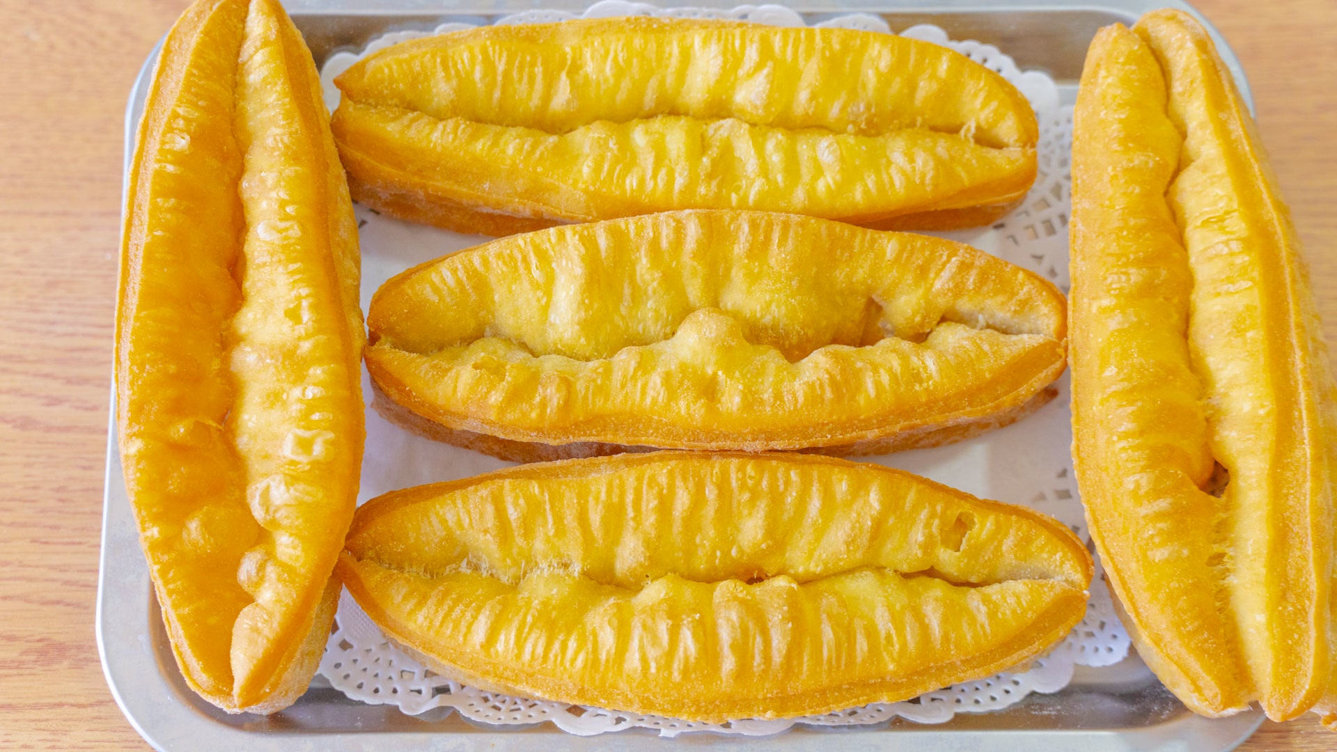 我们的油条就炸好了,个个蓬松喧软、外酥里嫩,我们切开看一下,里面都是空心的,趁热吃非常的酥脆,放凉了也不会变硬,吃起来还是柔软的,口感非常的棒。