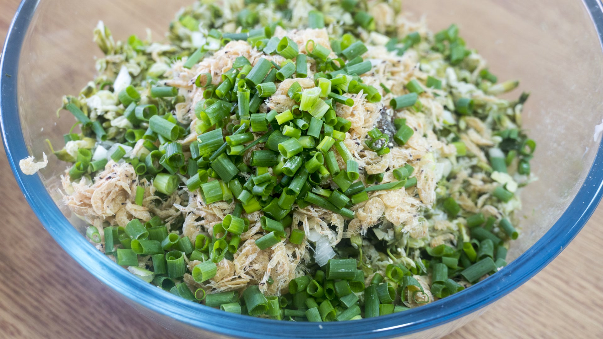 8、然后全部倒在一个大碗里面后调味儿,虾皮本来就是咸的,一小勺盐就够了,再来1勺鸡精,少许胡椒粉,1勺香油拌匀,这个素菜馅儿的真的超级香;