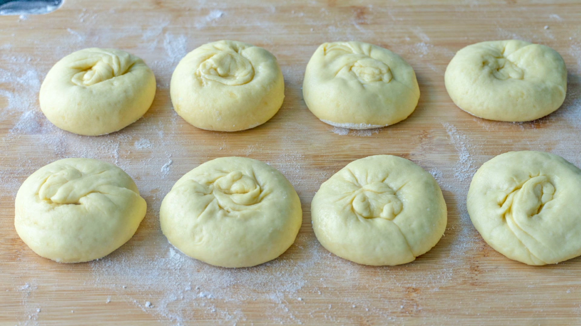 4、揉着揉着面团会再次变光滑,搓长条;分成同等分的小面剂子,继续将面团揉光滑,想要扎实一点的口感,每个面团儿就差不多要揉200下,揉100下左右基本可以达到要求,不过揉200下效果更好一些;