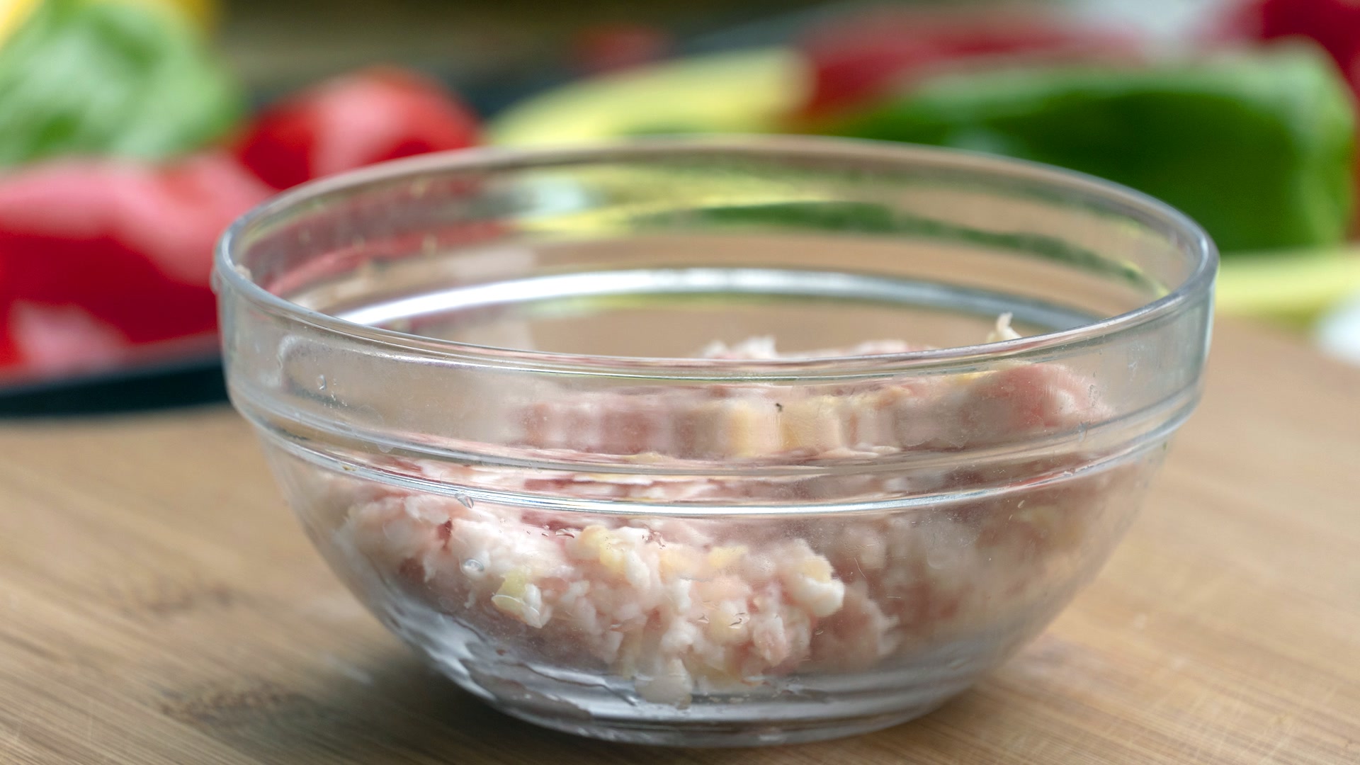 3、这时候槐花也泡好了,我们先把里面的水分挤出来。接着准备一块猪肉,切成小块儿后用绞肉机打成肉泥,倒出来后我们就可以开始调馅儿了;