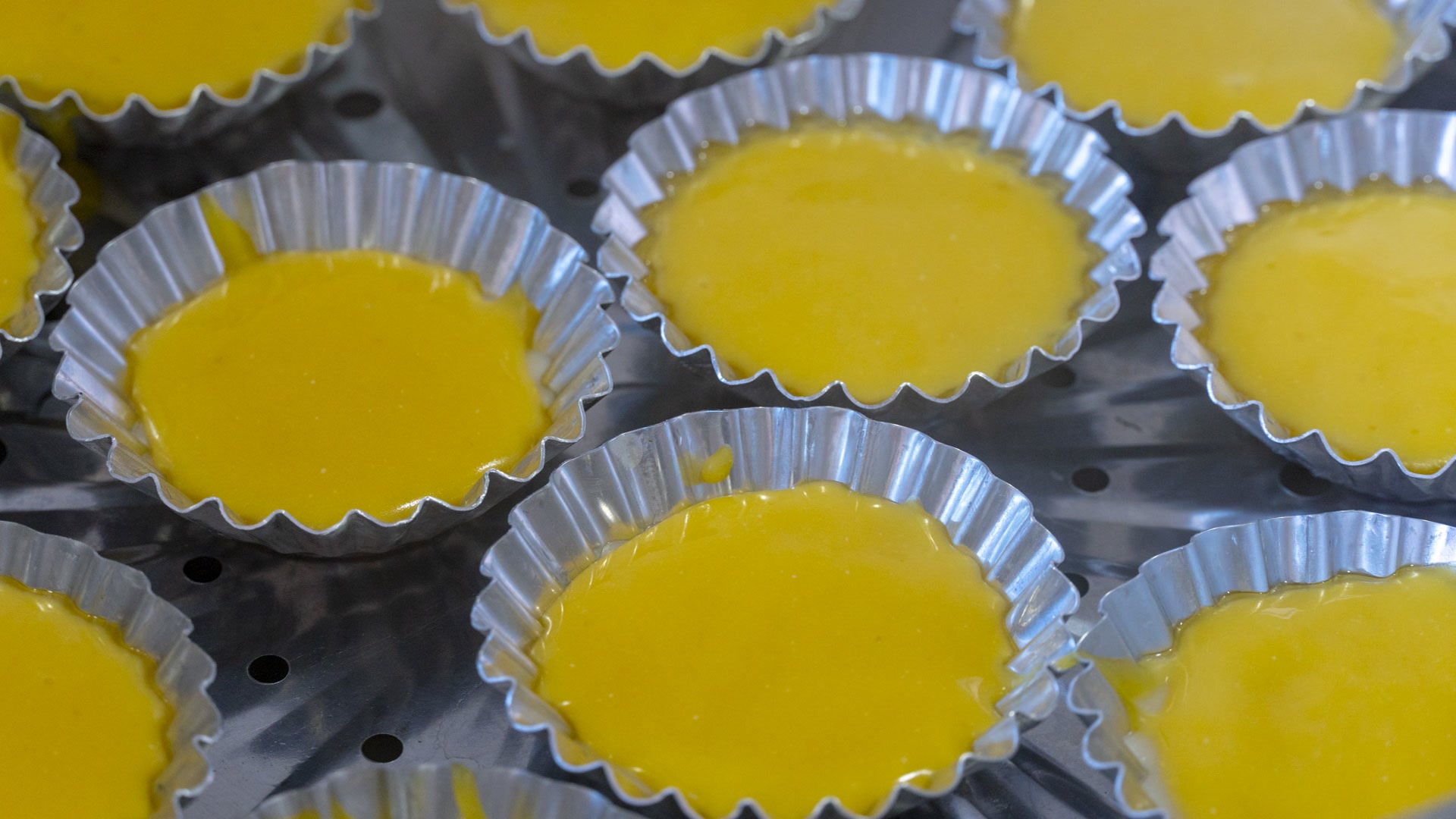 9、接着就可以准备模具了,大模具和小模具都行,先刷油防粘,然后盖上盖子,大火煮开后先倒一层黄色的粉浆铺底。
