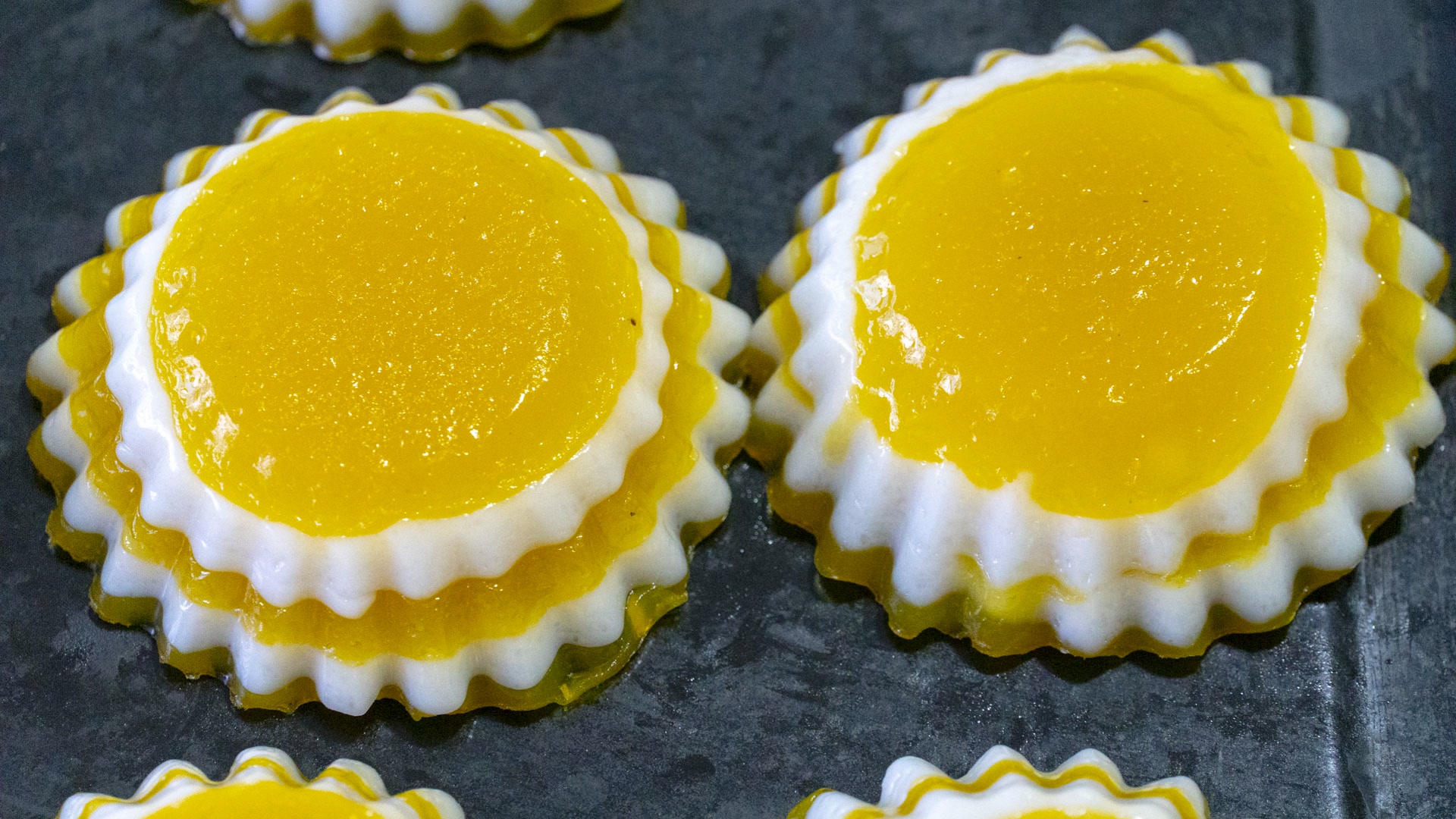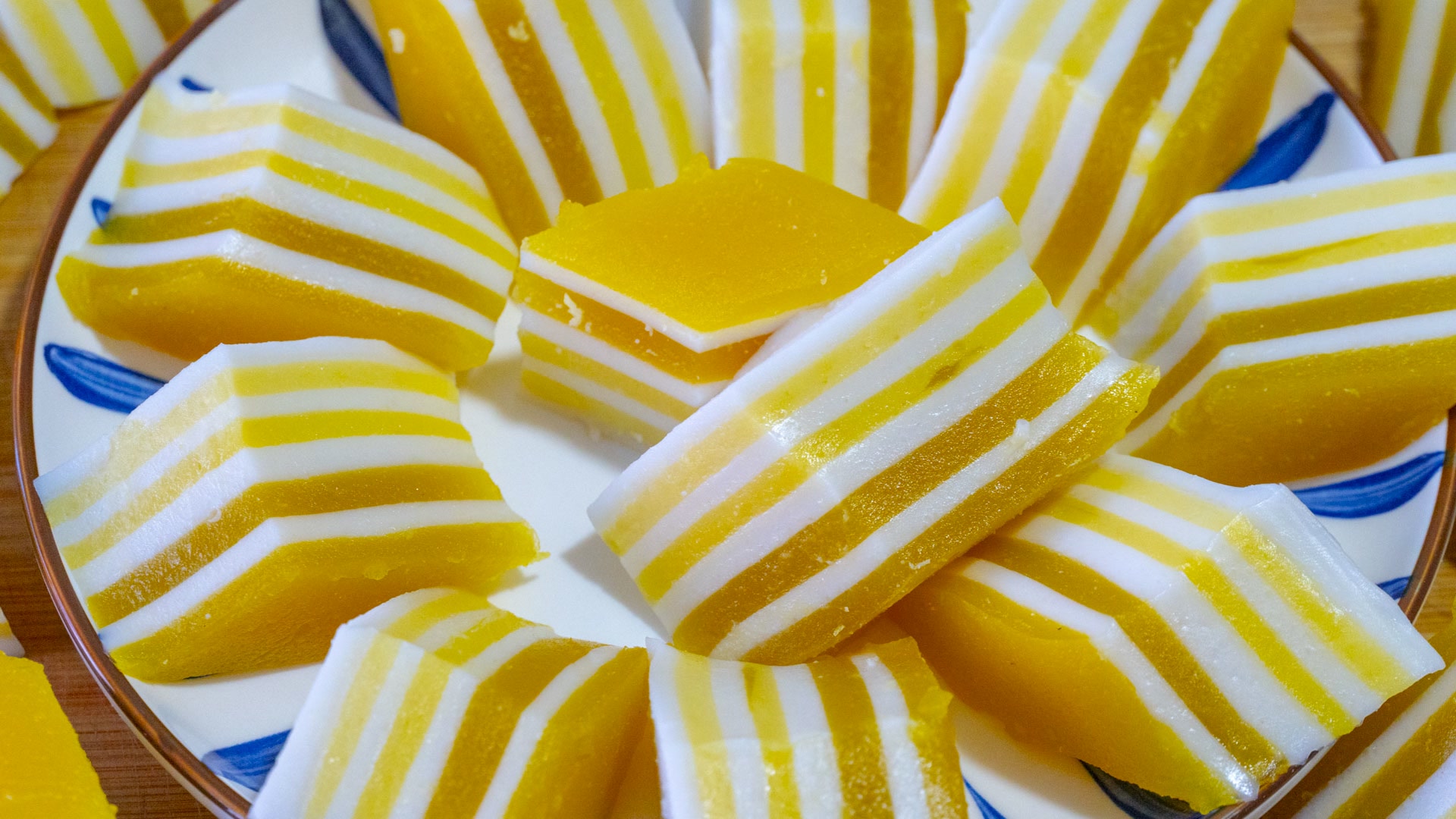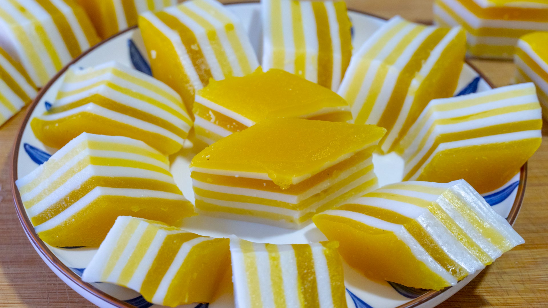 11、全部蒸熟后就可以取出来放凉了,还剩了一些粉浆我就用的盒子蒸的,同样的一层黄色一层白色的倒入蒸熟,只是这个盒子比较大,倒入的粉浆也比较多,所以蒸的时间要稍微的长一些,5分钟左右才能完全蒸熟。