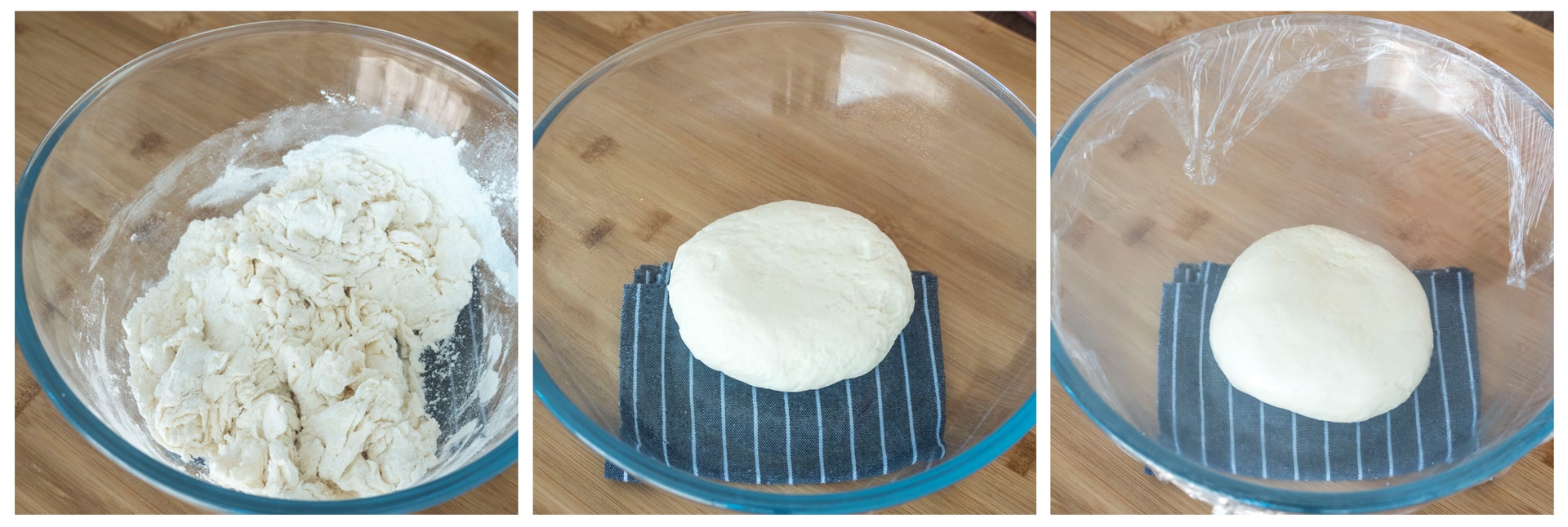 2、没有干面粉后上手揉面,先基本的揉成一个面团儿后盖上保鲜膜醒发30分钟;