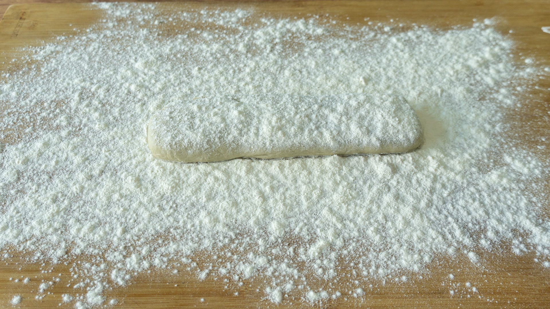 6、第二天先把面团儿拿出来回温1个小时,接着砧板撒干面粉防粘,面团儿取出来后不用揉。