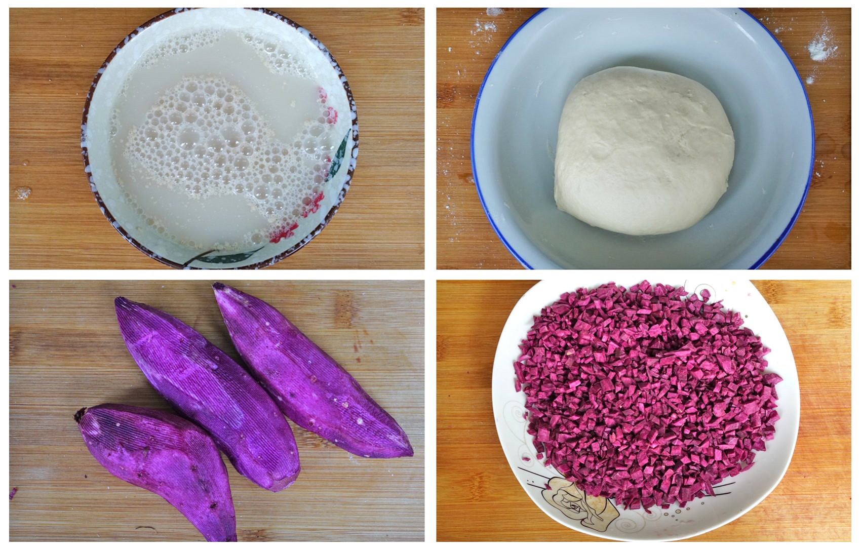 3克酵母、180毫升温水、面粉 300克、白糖 30克、紫薯