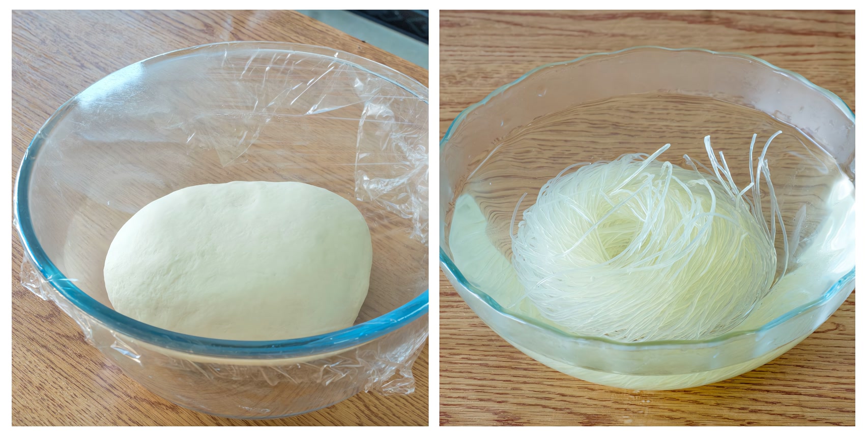 2、这个时间我们刚好来发面:中筋面粉400克、酵母4克、白糖3克、温水200克,用筷子搅拌到没有干面粉后上手揉面,我们给它揉光滑后盖上保鲜膜醒发至2倍大;