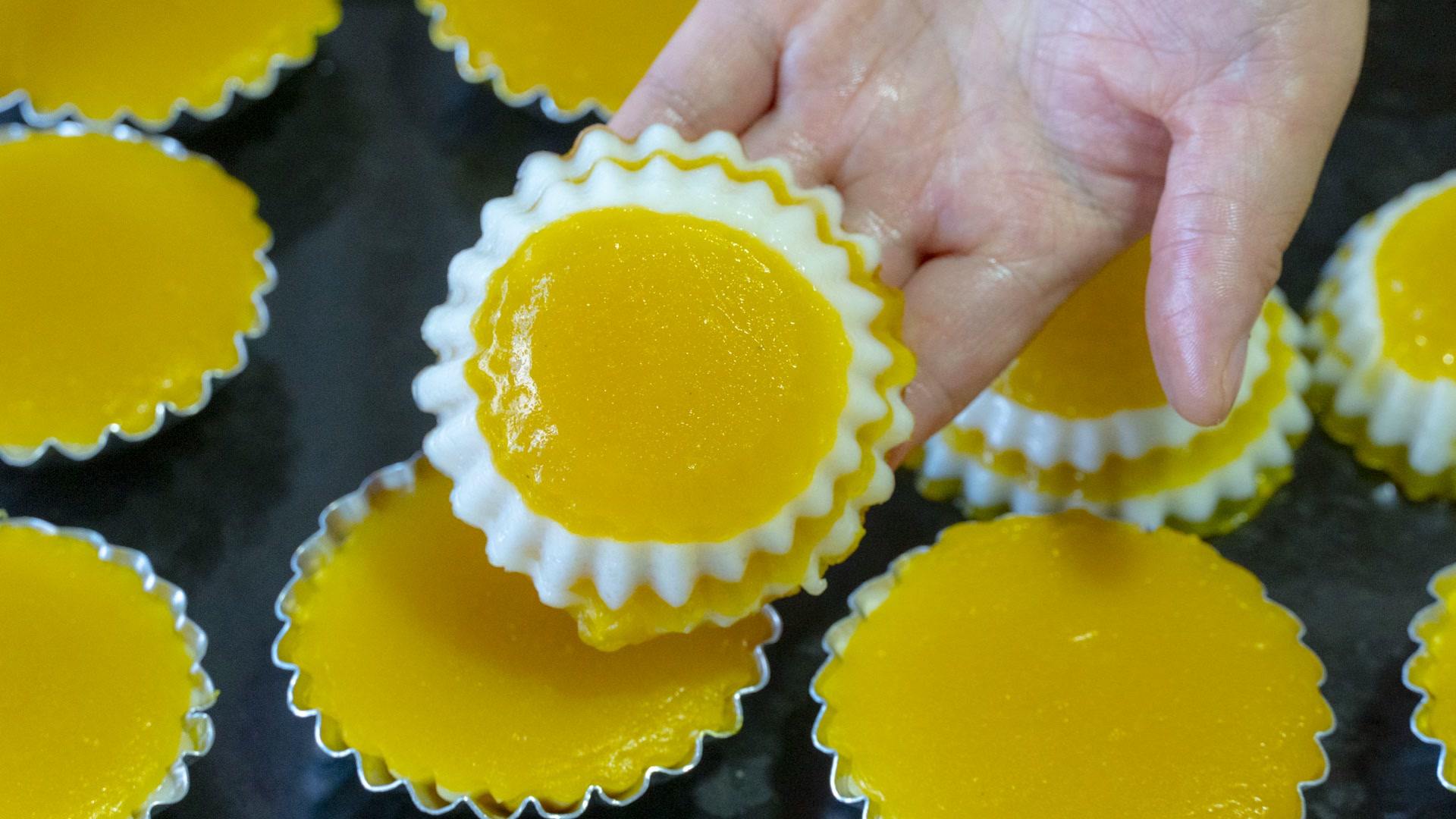 12、全部蒸好后也取出来放凉,这时候小模具的已经完全凉透了,用手指轻轻一掰就脱模了,倒出来就是一个完整的马蹄糕。