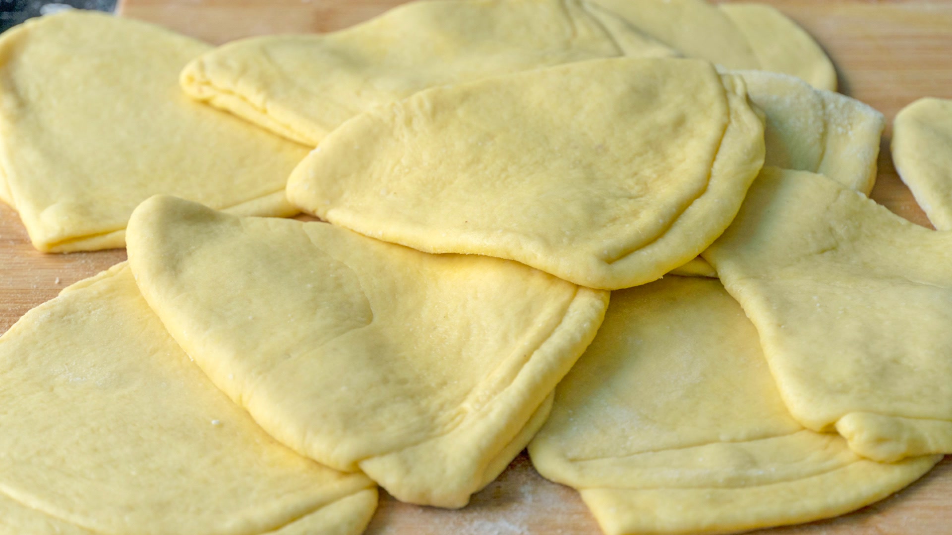 全部做好后再来擀开,先擀成牛舌状,再对折,继续对折,小三角形就出来了,再擀开,我们的小烧饼生胚就做好了;