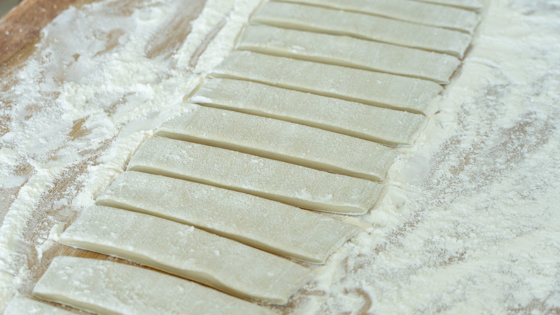 8、切成宽2厘米左右的长条,然后用筷子沾水后打水线。