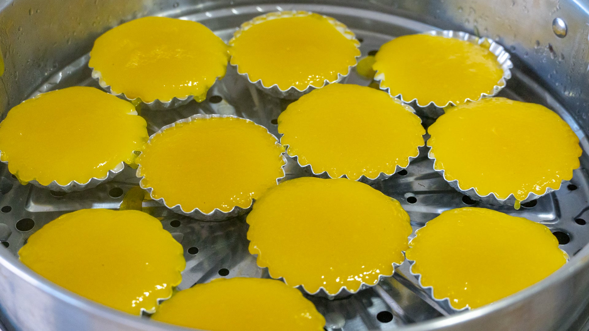 后面都是一样的,一层黄色一层白色,最上面和最底下都用黄色的粉浆,这样蒸出来的颜色更好看一些。